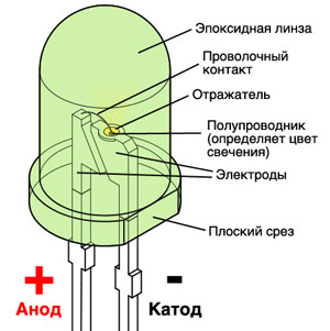 The main component of an LED is a semiconductor, which emits light when current passes through it. It is surrounded by a reflector that directs light in the desired direction and is encapsulated in a transparent epoxy housing. Sometimes the housing is painted, but this is just for convenience so you can determine the color of the diodes without turning them on. In fact, the color of the diode is determined by the type of semiconductor crystal