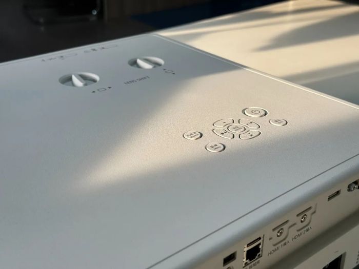 Its control panel is located on the top of the fuselage, so we can very conveniently perform common operations such as power switches, menu operations, trapezoidal correction, lens displacement, and sound and picture input. It is very practical.