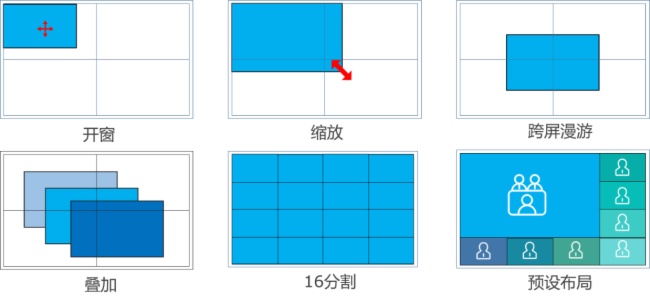 Visual operations: signal preview, large screen playback, plan call, large screen cross-screen window opening/zooming/roaming/window superposition.