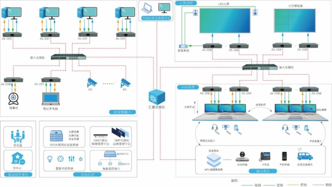 AS-ADS 高清分布式显控坐席解决方案基于 IP 化、无中心化的设计理念,运用嵌入式架构,为用户提供音频处理、视频拼接处理、视频会议处理、网络传输、环境监控、KVM 坐席协作、可视化控制等多种功能集于一身的现代化、网络化、互联互通的智能化管理平台。