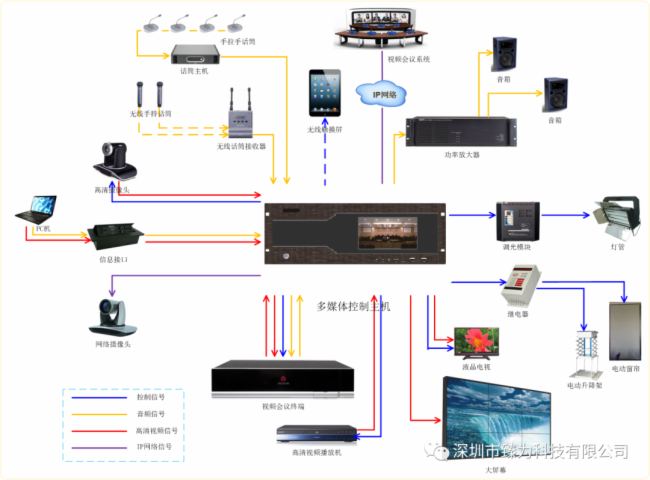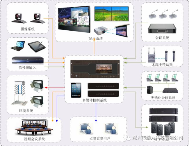 The standard conference room has a small space and generally adopts a round-table layout. It is mainly used for daily internal meetings, video conferencing, remote interviews, training, etc. It mainly includes the following systems: