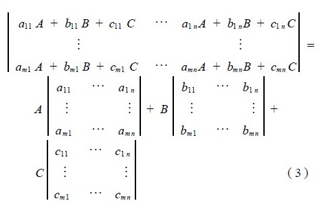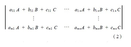 其中,A、B、C 代表着具有单位亮度的 R、G、B 三原色,系数 aij、bij、cij 为零和正整数,它决定着混成该像素点颜色所需 R、G、B 三色的亮度份额。If the brightness of the three primary colors R, G, and B contained in the white level brightness of the image is equally divided into N levels, then each brightness is A, B, and C, i.e., unit brightness. The values of aij, bij, and cij are from 0 to N respectively, which means that the color of the pixel point corresponding to the element can be blended with the aij component red, the unit brightness of bij component green, and the unit brightness of cij component blue. According to the matrix algorithm, matrix (2) can be expressed as: