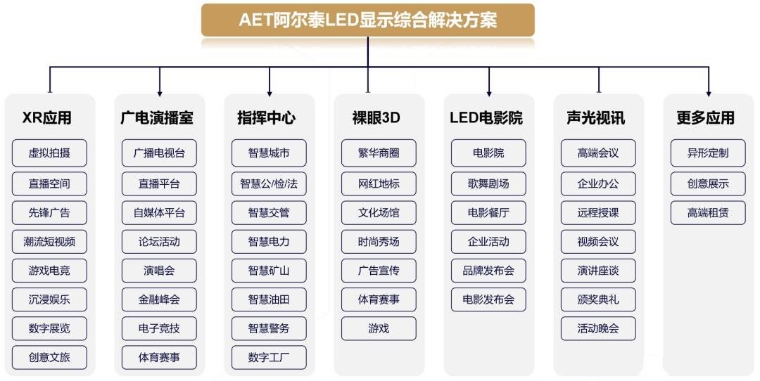AET Altai's LED display integrated solution is like a beam of sunlight illuminating the earth, covering six key areas in a comprehensive manner. It not only embraces the deep foundation of traditional fields such as radio and television studio, command center, sound and light video, but also boldly expands to the vast world of emerging markets such as LED cinema, XR application and naked-eye 3D with the courage of pioneers. This grand layout strategy of the whole scene is just like a considerate waiter, aiming to carefully cook a more precise and diversified service experience feast for users with different needs, so as to meet the unique visual and functional needs of each user in different scenes.