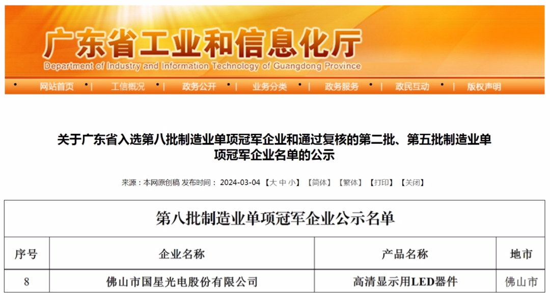 In the vast world of manufacturing, every honor is like a bright star, illuminating the way forward for the company and guiding the direction of industry development. Recently, the list of the eighth batch of national manufacturing champion companies announced by the Guangdong Province Department of Industry and Information Technology has undoubtedly become the focus of the industry's attention. In this list with extremely high gold content, Guoxing Optoelectronics stands out and successfully makes the list with its independently developed LED devices for high-definition displays. This honor is not only a high recognition of its independent innovation capabilities, but also a national recognition of its excellent strength, adding a new color to the high-quality development of the company.